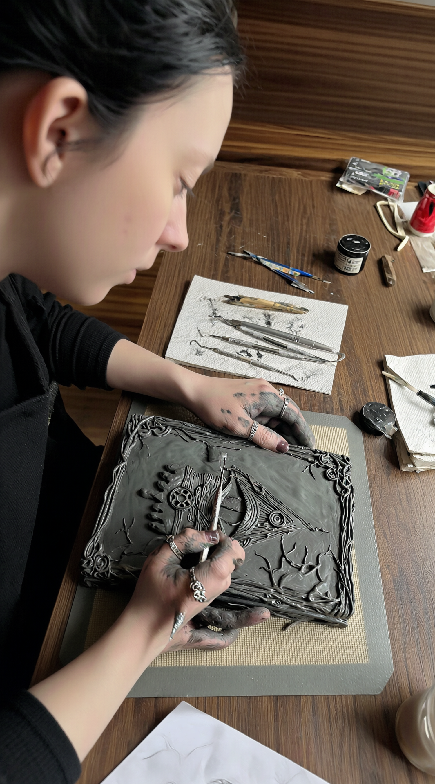 I make every journal alone, at my desk, by candlelight. I sculpt the resin, layer the paint, set the eye by hand. There is no factory. No assembly line. Just me, my tools, and the kind of silence that only comes at midnight. Each one takes days. And because the ring binder never fills — you can always add pages. It grows with you. I refuse to ship anything that doesn't feel like something. 🖤